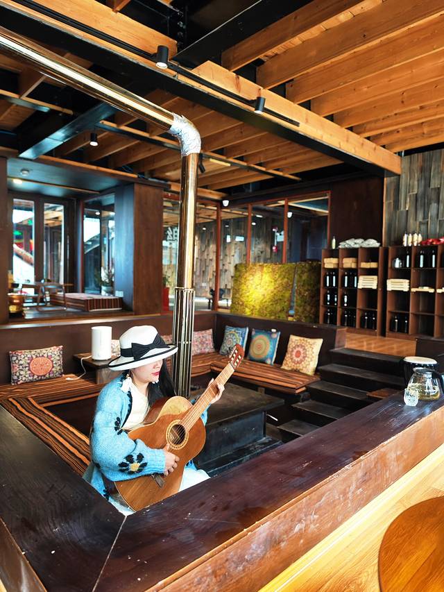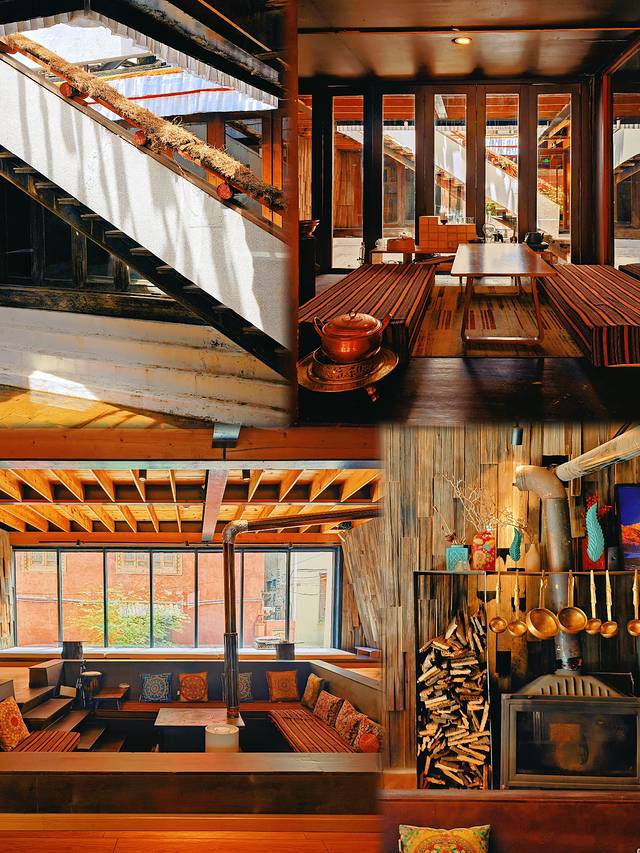 这次幸好选对了民宿,一走进乐兮,就感受到浓郁的藏族风情。粗犷的石墙、精美的雕刻、艳丽的色彩,还有围炉、乐器、壁炉、实木家居、柔软的织物,温暖的灯光和细节的装饰,每一个角落都透露着主人的用心,让你仿佛回到了家一般。