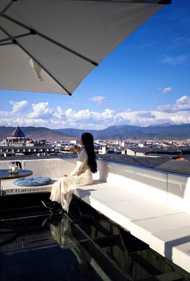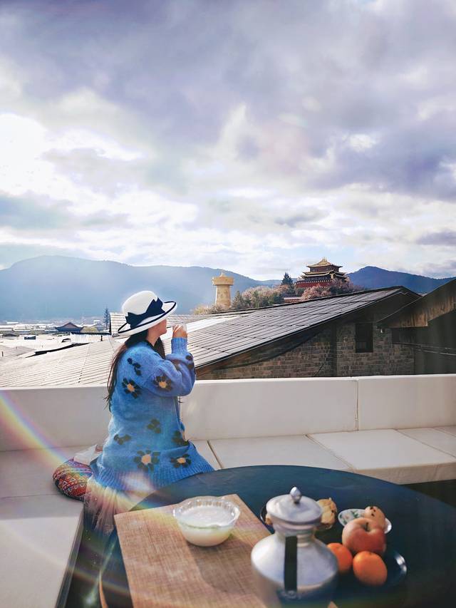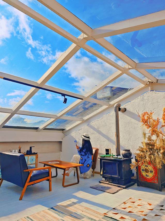 民宿顶楼的超大观景露台简直是一绝,在这可以俯瞰整个独克宗古城,远处的山峦、古老的寺庙、热闹的街市,一切都如画卷般展现在你的眼前。还有旁边的阳光玻璃房也很nice。我在这吃早餐、享用下午茶还有看书,一呆就是半天。