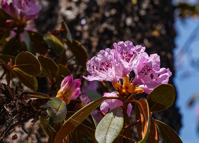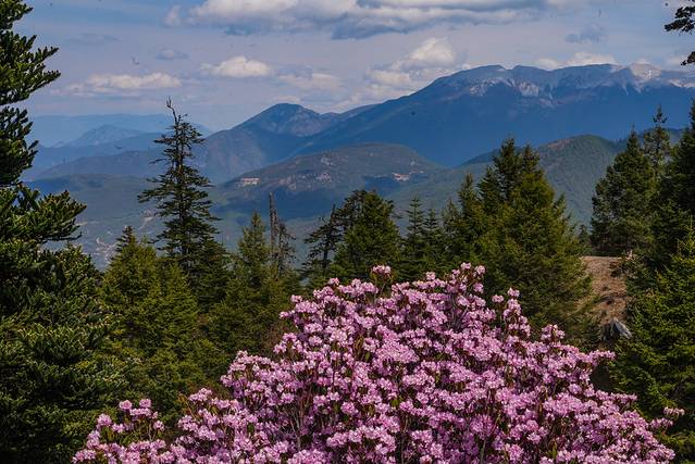 我们这次从香格里拉城区出发却是反走,沿着去三坝乡(白水台)的公路一路前行,经过普达措国家公园,翻越洗脸盆垭口之后,这里的花正在悄悄开始盛开。