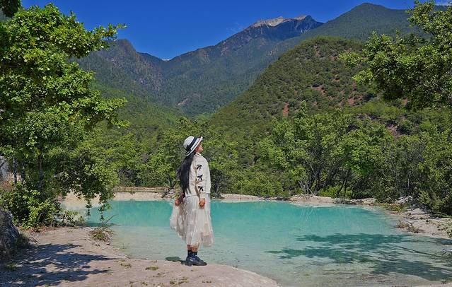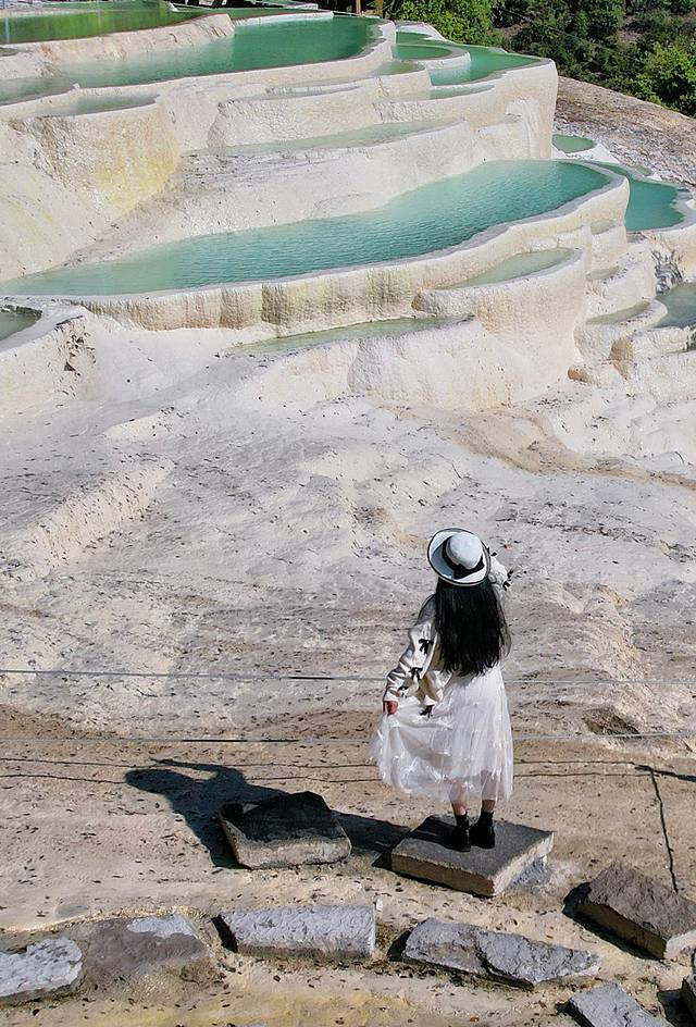 那是一片宛如仙境的白色世界,层层叠叠的碳酸钙台地,在阳光的照射下,闪烁着晶莹的光芒。它们像是无数块白色的玉石,堆砌在一起,形成了一片壮观的景象。每一块台地都仿佛是大自然精心雕琢的艺术品,形态各异,却又和谐统一。初见白水台,我被它的纯净所震撼。