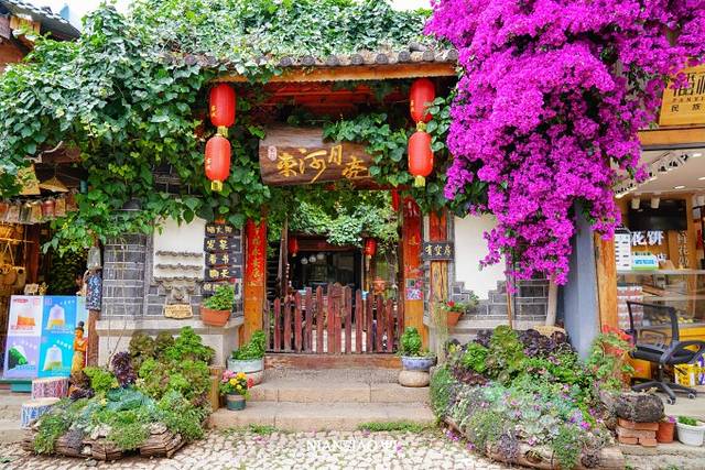 束河 古镇可谓姹紫嫣红,鲜花随处可见,艳丽争芳,古镇内屋舍错落有致,巷道间流水潺潺