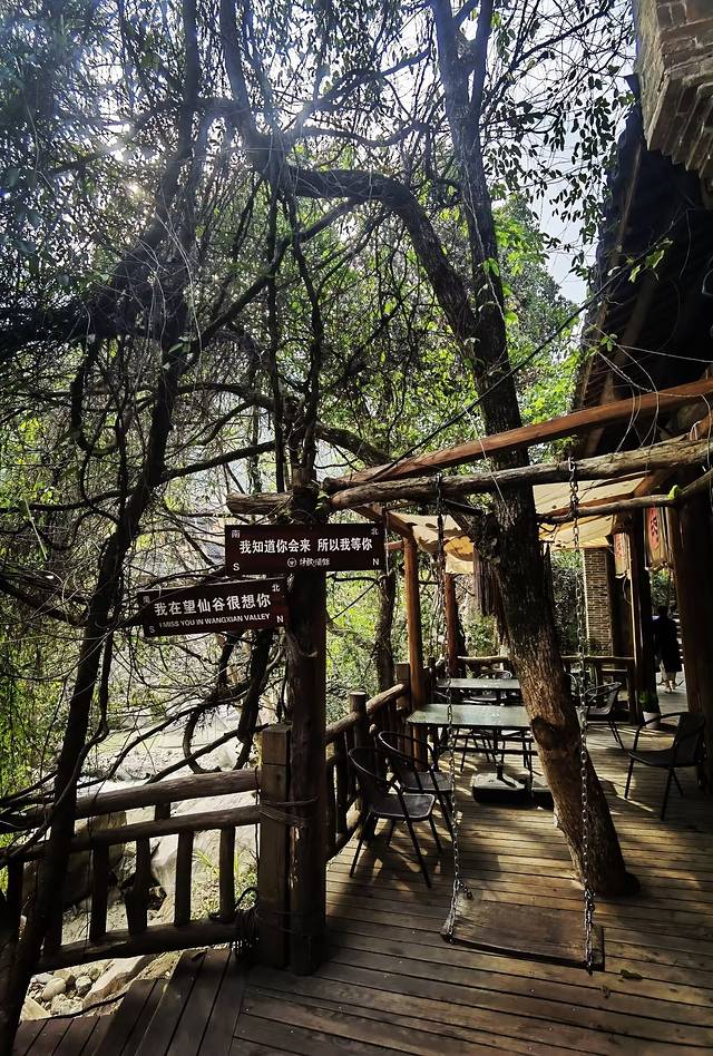 九牛溪是贯穿整个望仙谷的一条主溪流,溪流两岸都有栈道,围绕着九牛溪,形成了一个闭合的“O”之步道,行走在这条步道上,远山近水的旖旎风光,尽收眼底。这条步道曲折回转、蜿蜒连绵,步道沿途有森林秘境、竹影叠翠,有山里驿家、酒肆茶坊,这里水流潺潺、瀑声隆隆,这里鸟声啾啾、清风簌簌,我的感觉就是有“远上寒山石径斜,白云生处有人家”那么回事儿,随时随地我都想一屁股坐下,看山、看云、听风、听雨,然后来上一段在云端的美丽的故事。哈哈哈哈~有人说,美丽的故事总会在美丽的地方开始,不是么?!