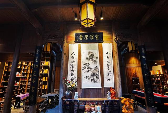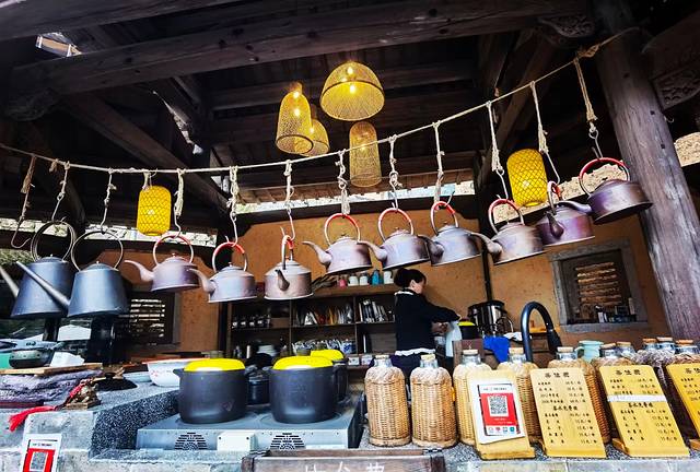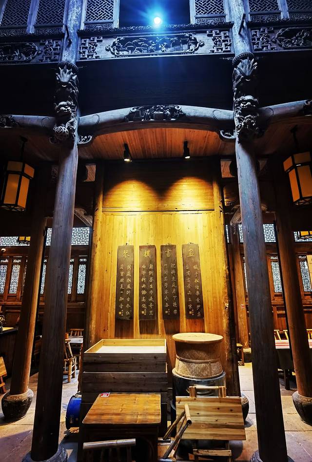 赣派建筑主要特色有三点:天井、围屋和三雕,在这座老宅里这三大特色尽可以看全。1、天井。在中国南方地区,普遍采用组合式天井模式,而赣派建筑中的天井是开合式的,是中国民居中独特的天井形式,现在的天井被置放了一排排小竹椅,供人围炉煮茶,这个天井貌似比室内来的吃香,大多数人会选择在天井歇息喝茶、打牌闲聊;2、围屋。赣派建筑中的围屋一般为方形,采用抬梁式与穿斗式相结合的技艺建造,一间围屋就是一座赣家人的城堡,围屋的外墙既是围屋的承重外墙,又是整座围屋的防御围墙,只不过现在临街的一侧已被改建成镂空式的现代样式,其它三面还是高不可攀、森严壁垒;3、三雕。赣派建筑中的木雕、砖雕、石雕通常被称为“三雕”,它们雕工精湛、栩栩如生,题材丰富、内涵十足,有神话传说、也有历史故事,有当时社会人文面貌的展现,也有房屋主人心愿期盼的表达,这三雕主要集中在主楼,很值得一看!主楼的两楼是包房,设计布置的很古典唯美,拍大片绝绝子!不过进包房设最低消费的。