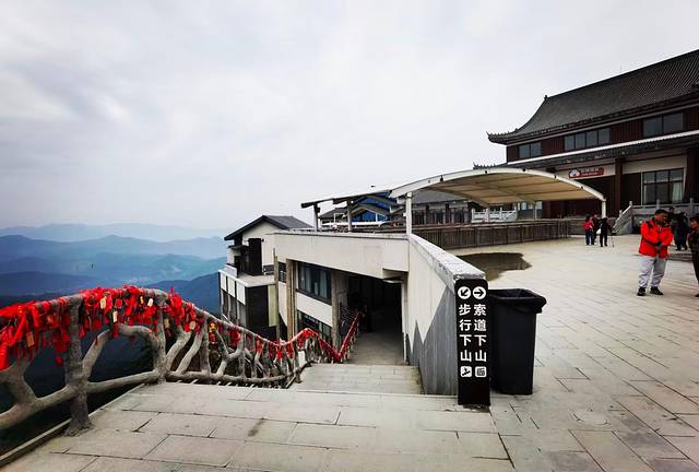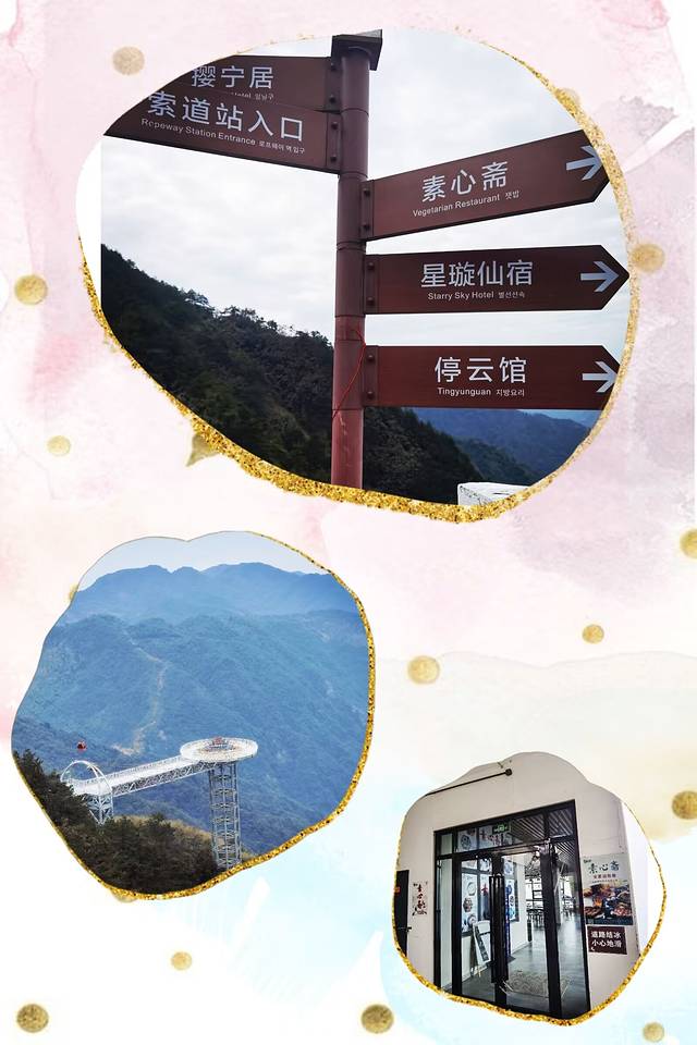 索道上站这片区域是一个供人休憩、补给、调整的位置,有各类铺子,这里有一家景观餐厅“素心斋”在网上很红,我们原准备午餐去这家餐厅吃一碗素面的,走过去一看关门了!愿望落空。这里还有一个收费的玻璃悬廊,很短,感觉不是很刺激的那种,都没看见有人去走。