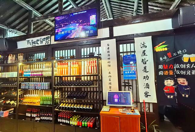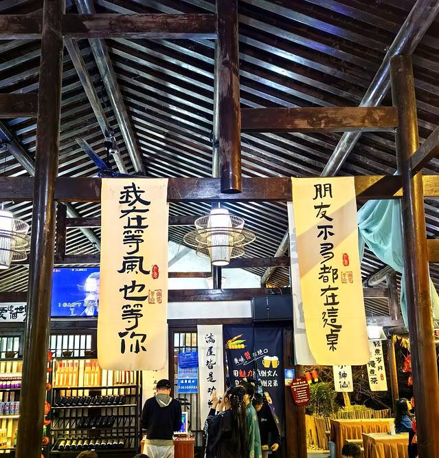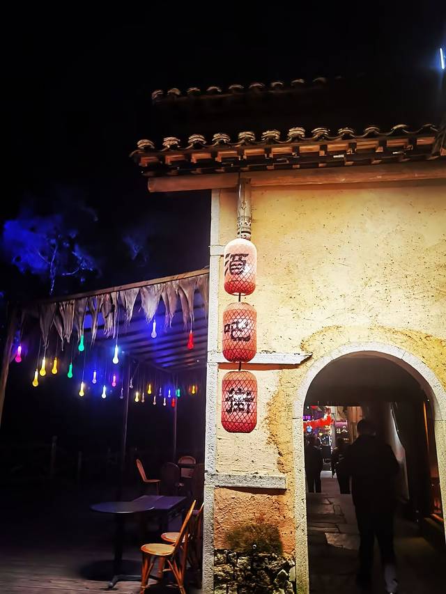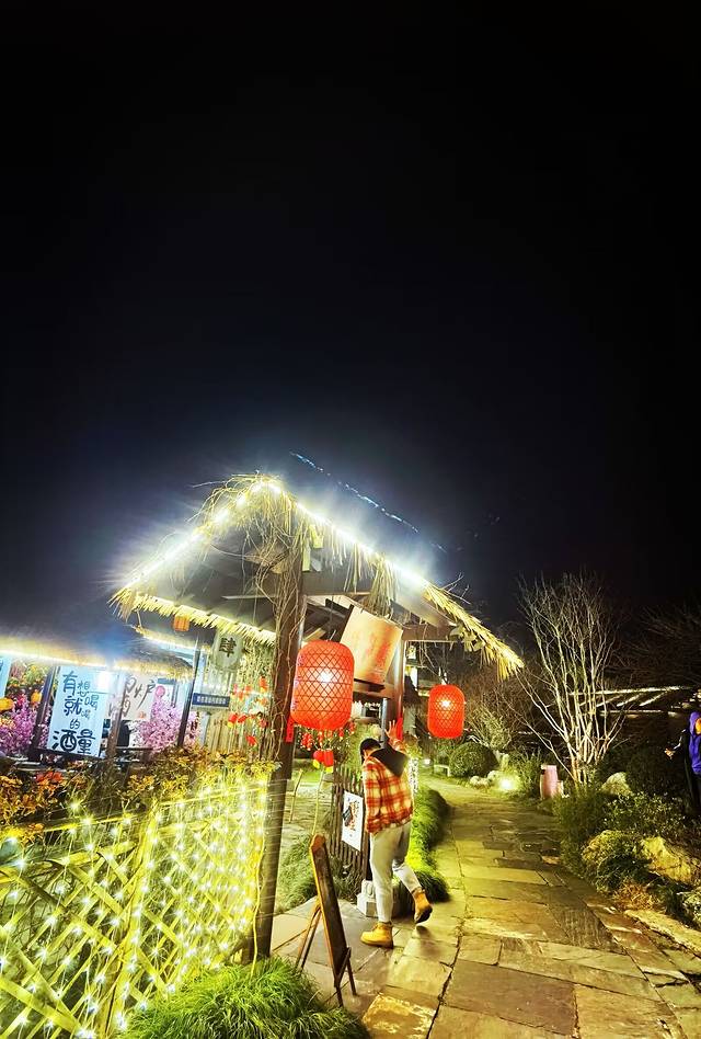 酒肆座落在湖畔的一座小岛上,岛上遍植桃花,洋溢着满满的乡村气息,农舍竹篱笆门上的“酿酒坊”和屋子里的一个个大酒坛子点出了这家主人的身份,其实这是村里的一个小景点“酿酒坊”。酒坊重现了当年葛仙翁酿酒的场景,展现了中国传统的制酒文化,还供应各种各样的米酒,除此之外,这里还是一个自娱自乐的综合场所,在这里可以围炉煮酒、也可以围炉煮茶,在这里可以以酒会友、也可以实力唱K,整座小岛很有氛围感,尤其是夜间,散发出迷人的气息,茅屋内、院落里,人还不少!一见到这样的场景,第一感觉就来电了~然后情有独钟了。