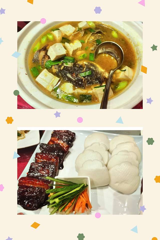 2、正餐。餐厅主理赣菜、川湘菜、江浙菜等,点菜有挑选余地,对不好辣这口的很友好。其中一道仙村招牌肉非常棒!这肉据说是用上好的黑野猪的五花肉制作而成,你瞧!色泽光亮、肥而不腻,肉质紧致、浓郁醇香,搭配爽口的黄瓜、胡萝卜丝和白面馒头,啧啧!好滋味~