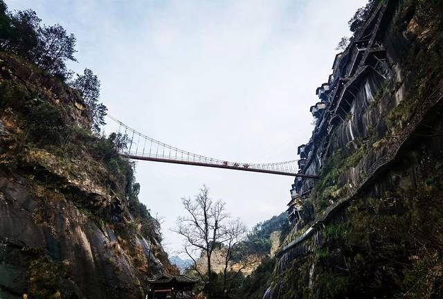 望仙谷的悬崖民宿,有30多间小木屋组成,这些小木屋高低不同、大小不一,最大的50平,最小的也有20平,看似不规则却有序地悬在高高的崖壁之上,小木屋与小木屋之间有木栈道相连,其中有一段还是玻璃栈道,看上去有点触目惊心的!从空中鸟瞰或从远处遥望或从谷底仰视,一间间小木屋就像一个个鸟笼子垂直的挂在崖壁上,尤为奇特。夜间亮灯,整个山谷灯火璀璨、五光十色时分,吊挂着的悬崖民宿星星点点、闪闪发光,更是醒目惹眼。住在这些鸟笼子里,真要有点一身飞檐走壁轻功的观感。