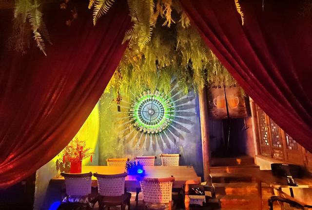 村里唱K的我们做过观察,在灵宝仙街上有好多家,其中有一家“音信咖啡厅”的地理位置超好,在众妙阁斜对面、太虚幻境正对面,咖啡厅有条长廊,看灯光秀和水上表演视线无遮挡,一级棒!音响话筒效果、厅内气氛营造也很专业,但我们没有移情别家,还是专情于桃源酒肆,因为感觉在村里唱K,就是要有村的感觉,在开放式的环境里吼一吼,要比在封闭式的包房里唱一唱,绝对来的酸爽,也更能展示自己歌唱的功力。露一手有时候也是要得!