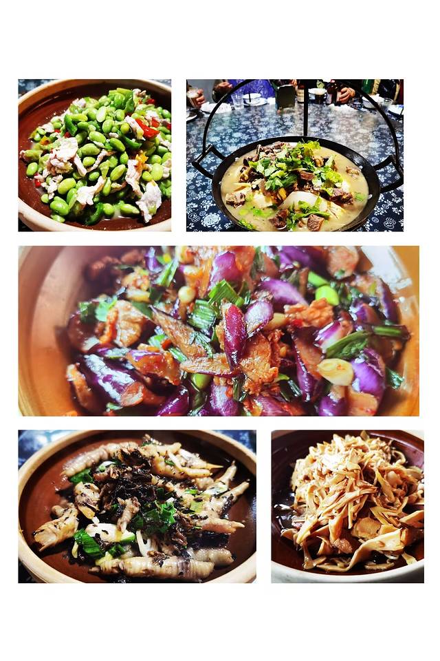 3、种草菜肴。前者家的油焖茄子、山笋烧肉,后者家的梅干菜烧鸡爪、牛肉调锅菜。这两家有个共同点,蔬菜类的食材都很新鲜,食材好、烹饪好,所以好吃!但荤菜类的有的像是预制菜,口感差了很多,因为看到这两家都接团餐的,所以有这样的猜测。粉蒸菜是江西的特色,在这两家都没吃到地道的江西风味,有点失望!尤其是前者家的粉蒸排骨,只见骨头不见肉,啃了大半天只闻到了点肉味,啃骨头的时候我一下子嫉妒我家狗子了!还有米饭,总以为山沟沟的米饭一定好吃的,么想到这米饭像是糙米,一点都不好吃!不好吃、不好吃,我还是干掉了一大盆。阿欧~我对毛豆炒肉和油焖茄子这两道菜强烈好感,非得种草不可!这个毛豆和茄子非常软糯入味,与我在魔都吃到的绝对不一样。是不是上饶的毛豆和茄子与众不同哇?!