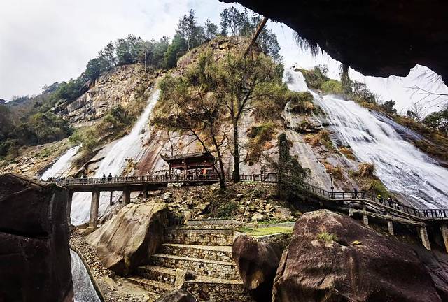 2、三叠水。这股三叠水源于西坑溪和方村溪的交汇合流,由于峡谷里的水自上而下,在两水交汇处形成大水量,然后呈阶梯状冲刷奔涌于高高低低、长长短短的石阶上,层层叠叠流入各级潭中,从而产生了形式不一、水量不同、水声各异的叠水景观。