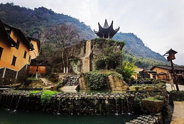 葛仙村的位置在葛仙山下的山谷里,这条山谷东西走向,呈狭长带状,南北两侧都是山崖峭壁,化身为度假村成为景区后,以一片水系、一条小街、一座村落的三条线状模式布局,分别打造成三个不同主题游玩区域。