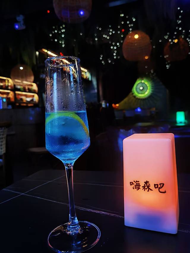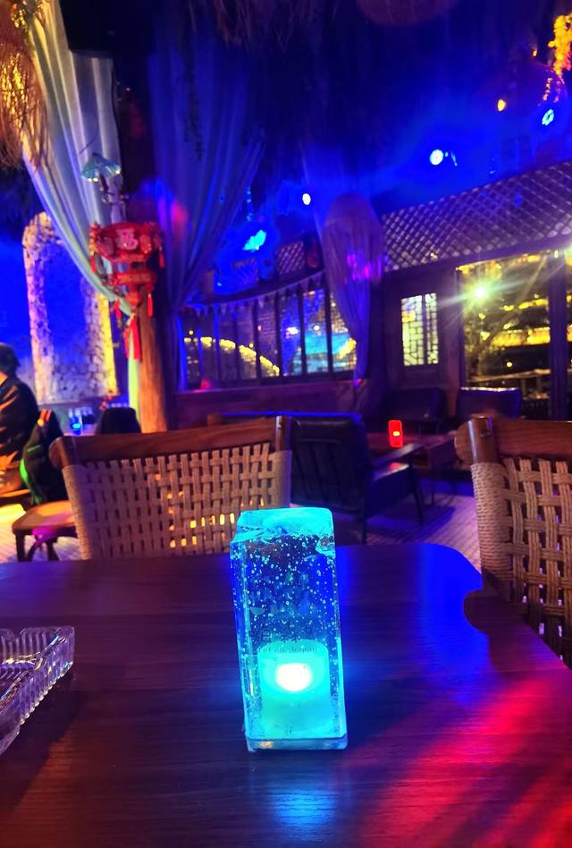 我们去了一家“嗨森吧”,这家酒吧地理位置得天独厚,就在揽月桥桥逸,室内环境有点东南亚热带雨林风格,靠九牛溪一边,有个很大的室外露台,上可摘星星月亮、下可探潺潺流水,近可看揽月桥、远可观白鹤崖,四周绚烂的灯火隐隐绰绰、交相辉映,把这座掩映在竹林葱郁的酒吧衬托得格外幽深静怡。