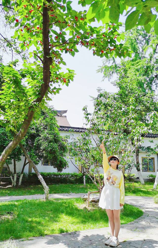 沿着蔷薇花墙继续往前走,就是樱桃园。妈妈说,樱洲的名称就是源于樱桃。康熙、乾隆年间,玄武湖的樱桃曾作为供品送往京城。如今,樱桃也是玄武湖三大特产之一。这是我平生第一次见到樱桃树,没想到它这么高大!殷红的果实挂满枝头,晶莹剔透,仿佛涂了一层蜡。晴天里,它们就像是闪闪发亮的红宝石,闪烁着惊艳的光芒。葱郁的树间,小鸟们叽叽喳喳地穿梭着。我惊喜地观察到,有只小鸟用尖尖的嘴啄一下樱桃,把樱桃叼在嘴里,东张西望后,又飞向另一根树枝,猛地一下吞了樱桃,小小的肚子也随之鼓胀了一下,享受这天然的新鲜果实。太有趣了!