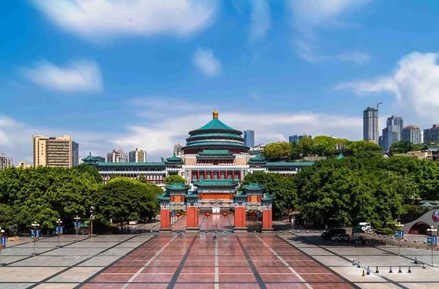 重庆市人民大礼堂,位于重庆市渝中区人民路173号,于1951年破土兴建,是重庆十大文化符号,也是建国以来第一座独具特色的宏伟古典建筑。人民大礼堂的设计,仿明、清的宫殿形式,采用轴向对称的传统手法,结构匀称,对比强烈,布局严谨,古雅明快。主体部分的穹庐金顶,以北京天坛的“祈年殿”为灵感,由大礼堂和东、南、北楼四大部分组成。