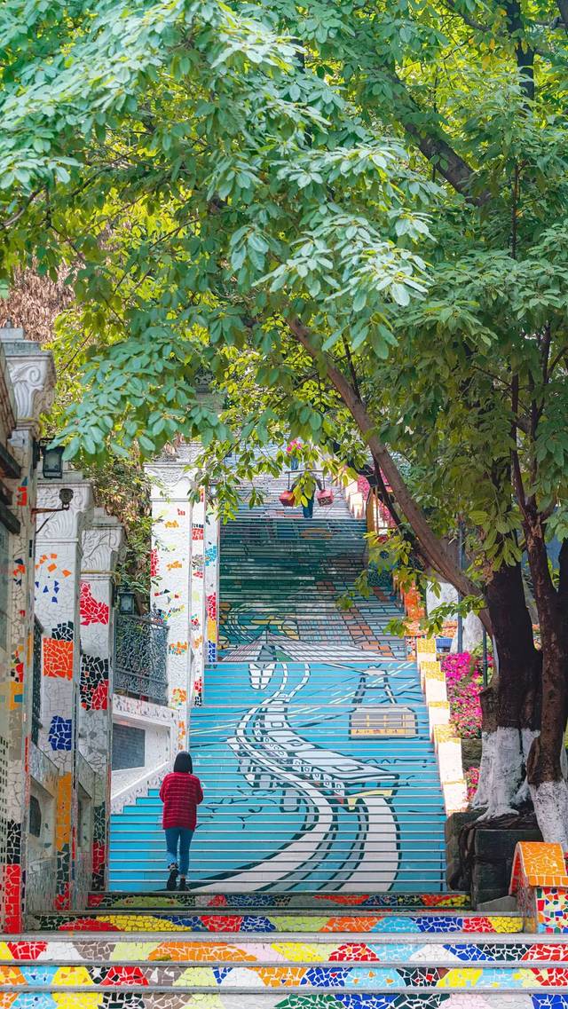 站在涂鸦阶梯底部朝上拍摄,可以将阶梯立面上色彩斑斓的瓷砖拼贴画完美定格,这也是“时光里”枣子岚垭步道公认的最佳留影位置。此外,还可以取景步道两边,拍出千禧年风潮文化。