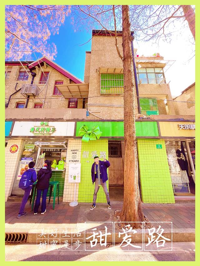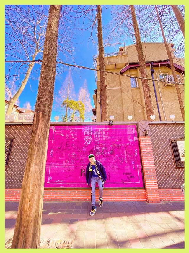 路口的三色爱心红绿灯、爱情邮筒、路道两侧28首爱情诗、路两侧还有表达涂鸦墙、路口的奶茶店、甜爱车站甜品店、好看的电话亭,好多出片打卡点。