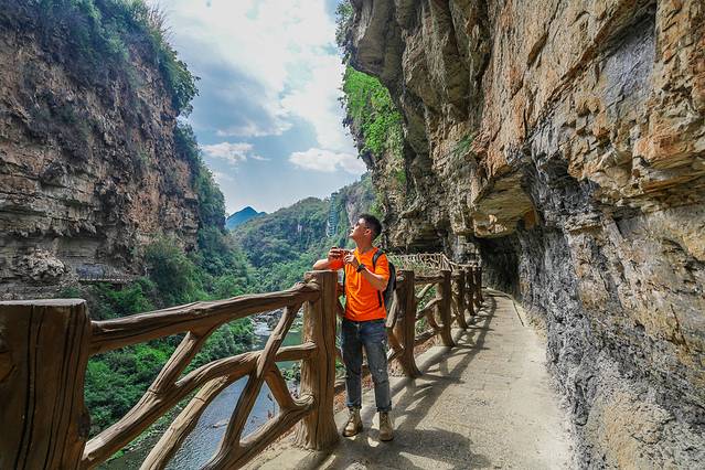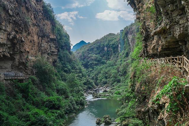 峡谷深幽,栈道攀崖而行,曲曲折折, 引人入胜,沿道而游,如进画中,一步一景,步移景异,令人流连忘返。“云奇石更奇,奇绝画难比。