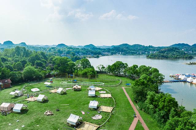 这里的风景真的很适合露营,这里有可以直接拎包入住的营房,也有可供下午茶的露营地、围炉煮茶等等,还可以泛舟河上,娱乐体验很丰富,可以悠闲的玩上一整天。