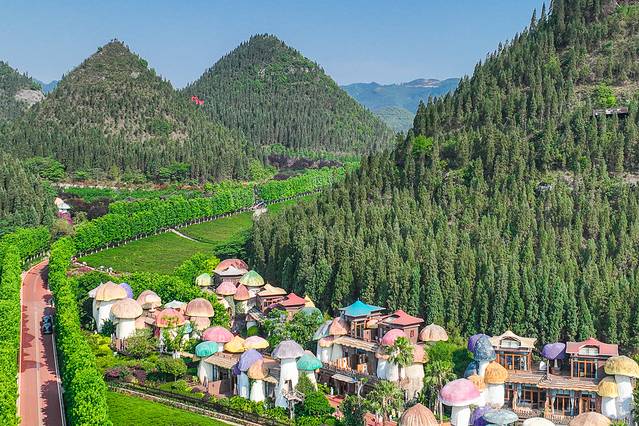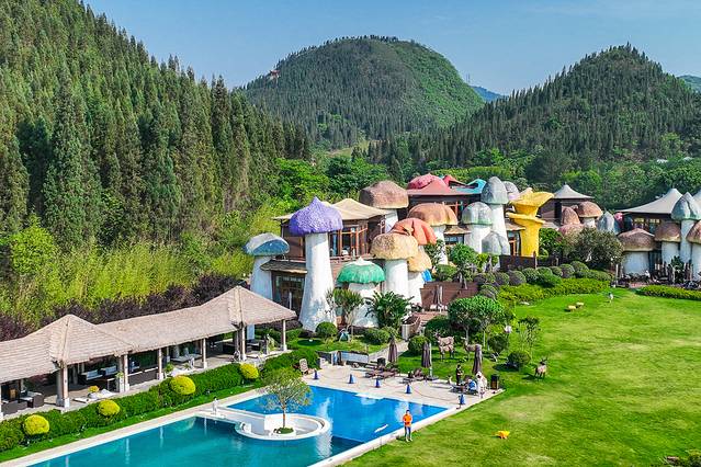 这里还有超受亲子家庭欢迎的蘑菇野奢酒店,林木葱绿,五彩蘑菇房林立、花海多姿、户外泳池等等,不想工作了就来这里住两天,感觉棒极了。