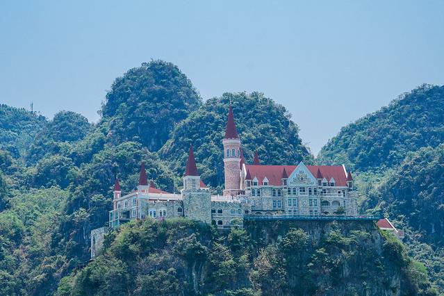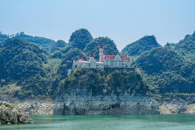 湖中的吉隆堡是万峰湖一道非常靓丽的风景线,模仿德国的天鹅堡建造,欧洲哥特风,融入在万峰湖的青山绿水间,乘船经过,宛如是走进了童话里的城堡。
