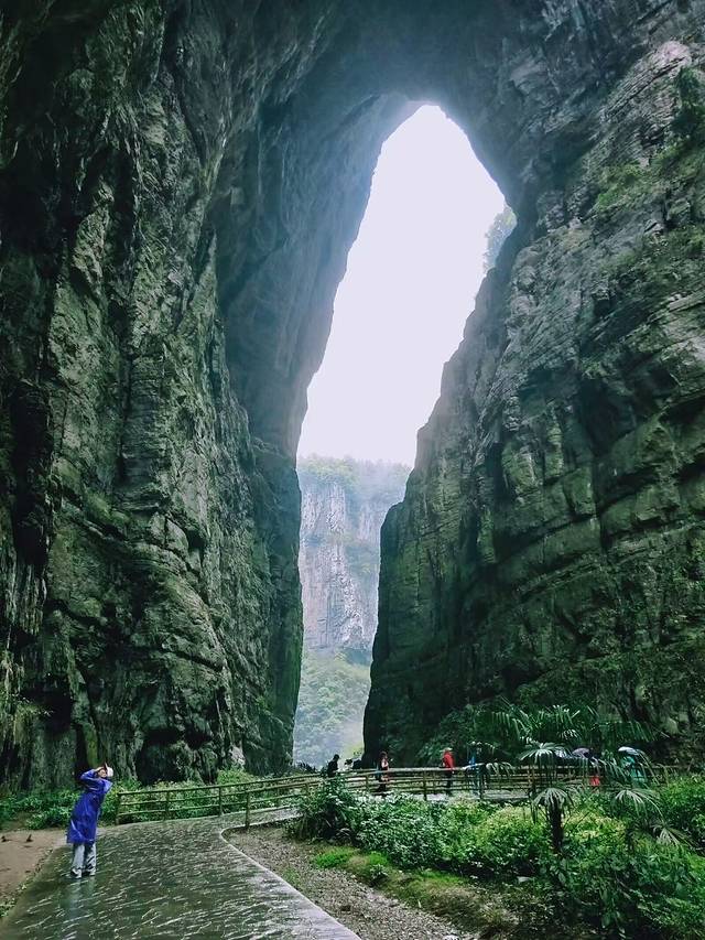 第二天早上醒来后天公不作美,下起了小雨,今天的行程是去武隆的天生三桥景区,楼下就有早餐店,简单吃了粥和包子后打车想去客运站,司机师傅知道我们想去的景点后就想让我们坐他的车去,想着天气不好,也想省点事儿,就谈好了价格100元直接送我们到景区,结果去的太早了,景区还没开门,而且景区在山里,比市区温度更低,怕感冒,就在路边摊买了雨衣,雨衣质量不错,挺厚实,真有保暖作用,而且下着小雨景区打伞也不方便,穿雨衣就很方便了。终于等到景区开门,旅行社的大巴也来了,景区有天生三桥+龙水峡地缝套票,成人230元一张,65岁以上的老人、学生都是半价,走起。