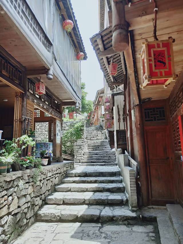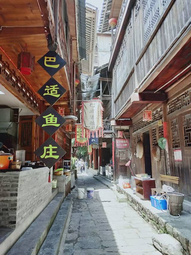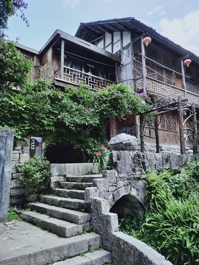 土家吊脚楼群临江而立,木质结构,分二至三层,上层通风、干燥、一般用于居室,下层用来堆放杂物,现在基本都用于客栈经营了