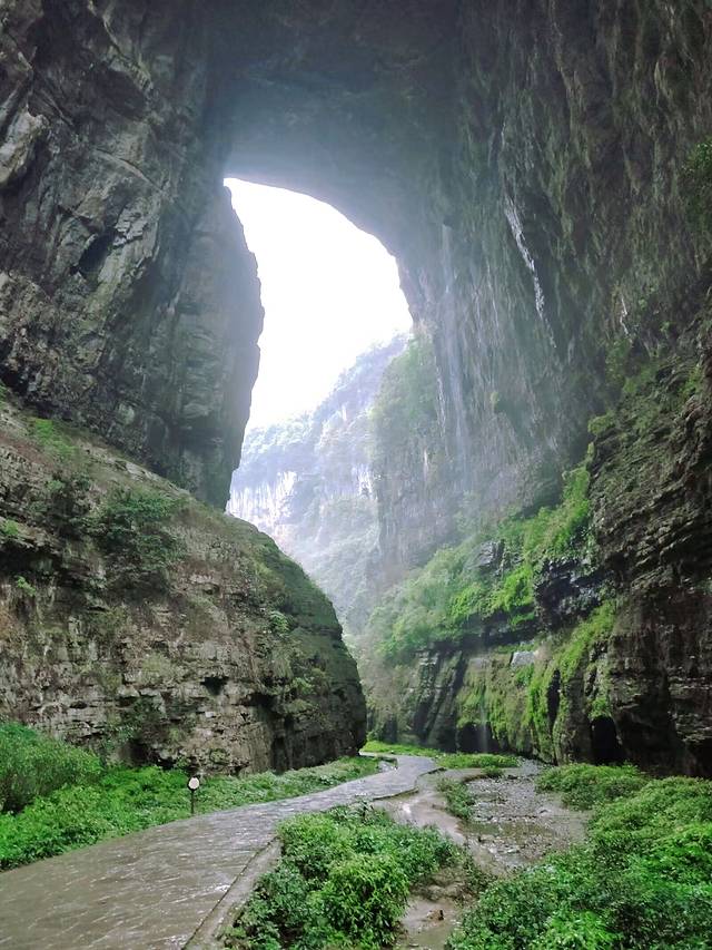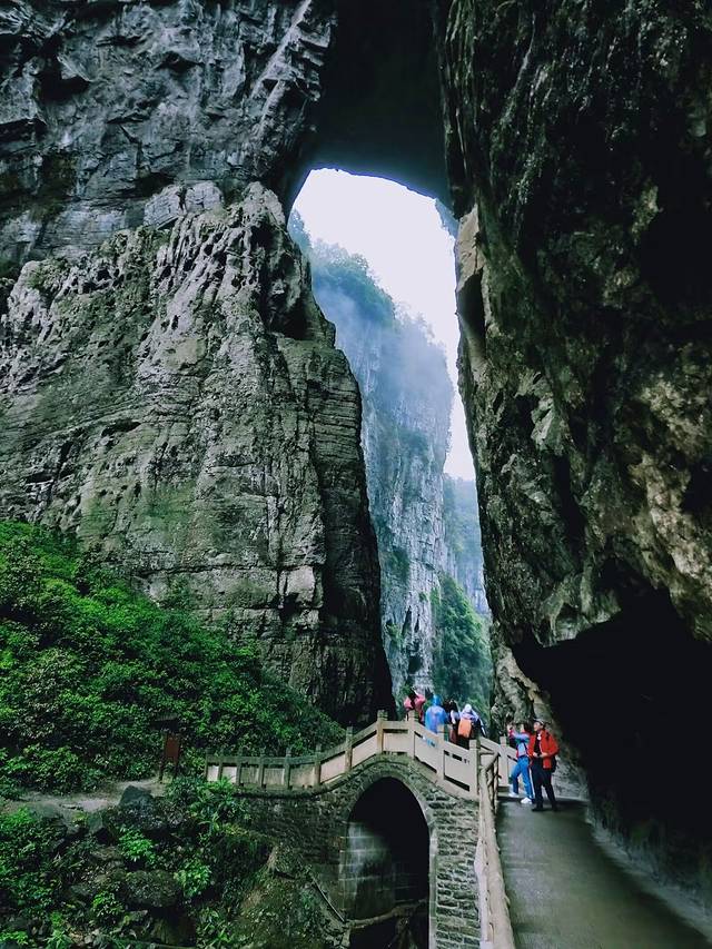 沿着游览路线往前走就是青龙桥了,青龙桥为羊水河峡谷上的第二座天生桥,又名中龙桥,在桥下仰视,拱孔高旷,壁立千仞,惊叹于大自然的鬼斧神工