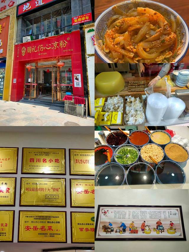 观赏完这些,我们可以去品尝一碗伤心凉粉,虽然它名为“伤心”凉粉,可是它是不会让你伤心的。伤心凉粉是安岳县周礼镇的一道著名小吃,起始于清朝,以豌豆为主料,口感爽滑,味道麻辣可口。凉粉的制作课程精细,调料配方独特,成为了安岳县的特色美食之一。