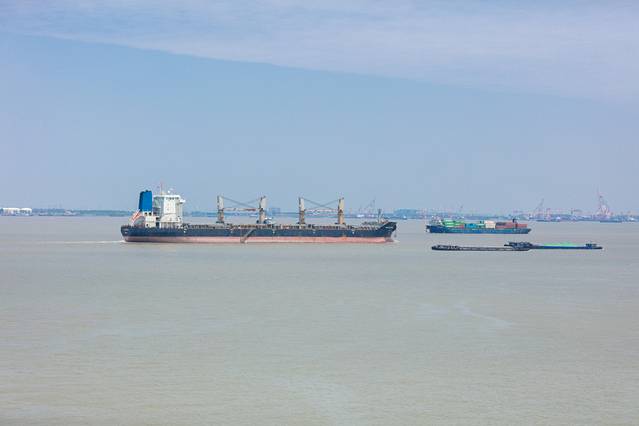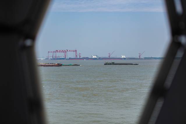 透过建筑向远处望去,这里是长江入大海的最后一湾,被称为江海交汇第一湾。江上船只往来,见证着这座城市的过往与辉煌。