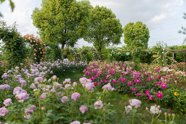 花园内相当美,玫瑰花颜色也很多。粉的浪漫、红的热烈、紫的优雅,一片片,一簇簇,朝气蓬勃。女孩子来这里拍照有种走进爱丽丝仙境的感觉。