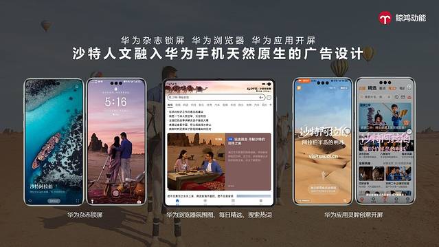 心动是行动的前提。鲸鸿动能将沙特之美自然融入华为终端杂志锁屏、浏览器、应用开屏等广告点位,携手打造华为智慧屏沙特风光大片,将自然与人文交相辉映的神秘异域风光呈现在用户的视界里,为更多用户打开了一扇沙特“沙特特别美”的窗口。