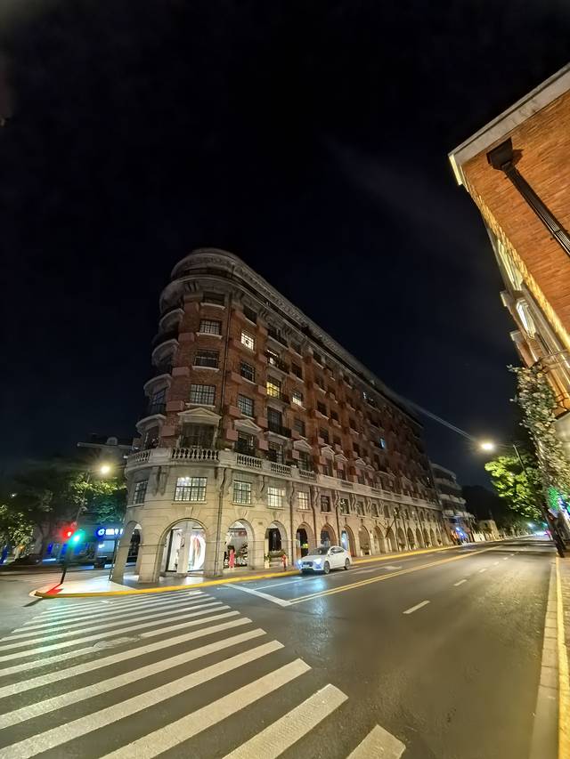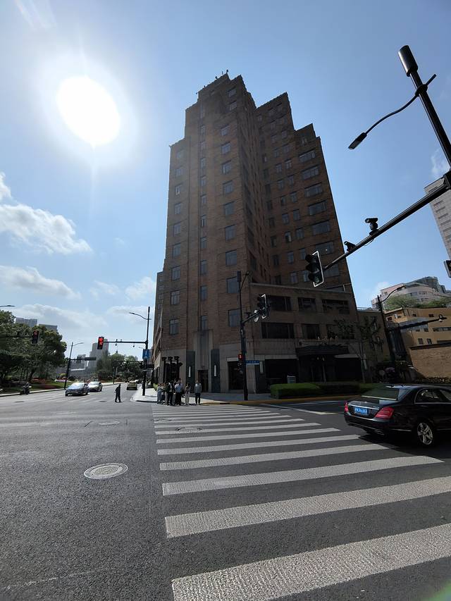这时,放羊姑娘提议既然餐已送到,而且也过了刚才的饿时候,不如先不回房间了,出去找一个便利店,把明天去迪士尼的零食都买回来,省得再明天现买浪费时间。于是我们又根据地图查找附近最近的便利店,发现俄罗斯领馆的北面有一家“罗森”,我们又向那家便利点开始进发。还好不远,过个马路走上200米就是。但是到了一看,人家闭店了😭。但是抬头一看发现了一个跟武康楼差不多的大楼屹立在Y型路口上。放羊姑娘建议,今天就拿他当武康楼,打个卡拍个照了了套马汉子的心愿!