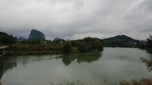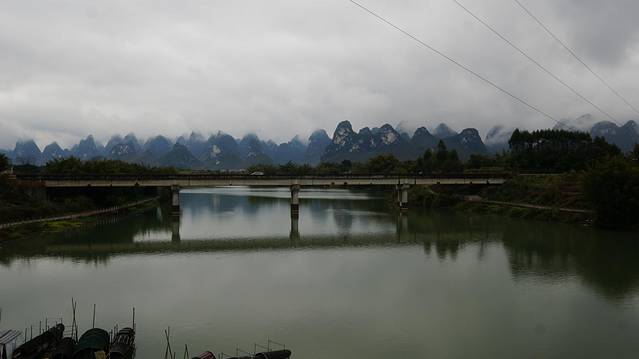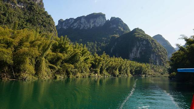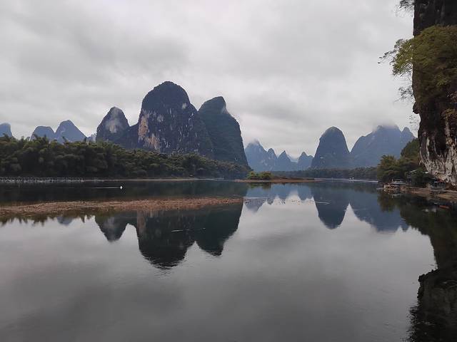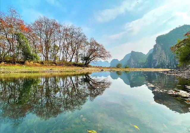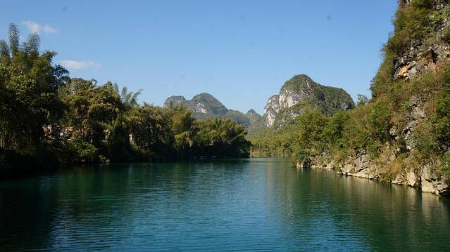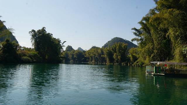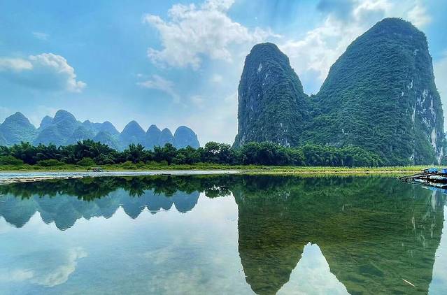 景区沿河展开,以喀斯特地貌为主,到处都是广西典型的秀丽山峰和水中倒影。