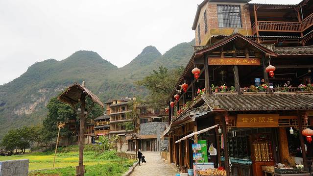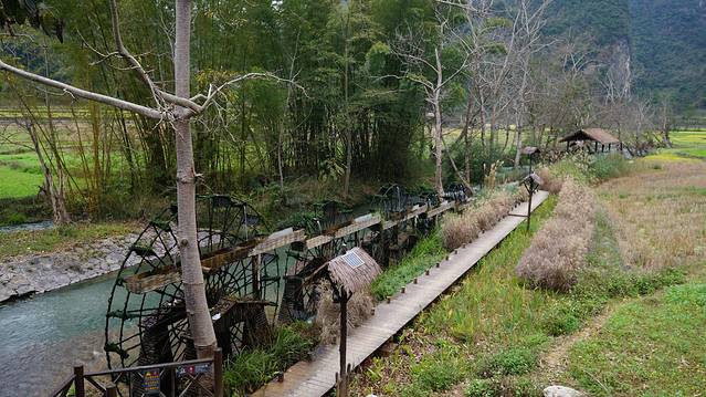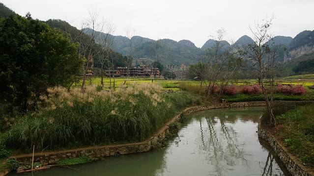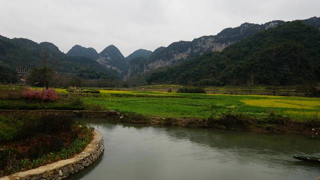 村子地处喀斯特地貌地带,四面环山,一条河通过三个溶洞穿越其中,溶洞即为该村的进出必经通道,这里才是真正的世外桃源,河谷、流水、翠竹、水车、农田、茅舍、桃花,诗意难比。
