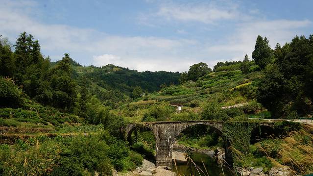 许村的箬岭古道又称千年古官道,是目前保存最完好的古官道。古道上保存完好的青石板,清泉,竹海,古村,古桥,古亭,茶园,野果,随处都是一幅绝美图画。廊桥上的观音像,是坐南朝北的,它跟别处坐北朝南的观音像不同,因为许村的有两座山,一座是公山,一座是母山。观音面对的是母山,自然选择不同的摆放位置,是尊重,更是期待。廊桥内有依傍木柱而修的长木板,有年过花甲的老人闲散的坐着,或聊天,或看着来往的行人。