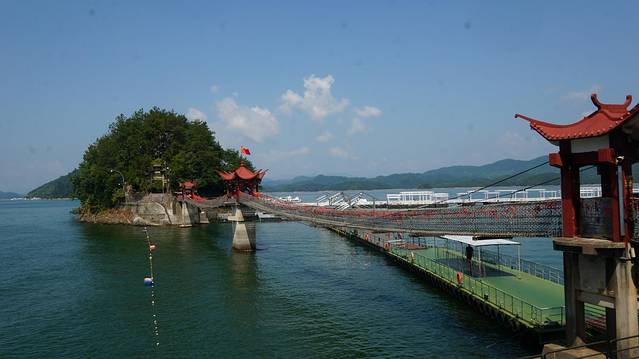 千岛湖是一个蓄水而成的人工湖,它的名气就在于湖中有千岛。可以想象在未蓄水之前,这些小岛都是一座座高耸的大山,这些大山的峰顶也应该是很少有人登临。现在这些大山成了湖中小岛。清清的湖水明澈见底,只见远处湖面上波光粼粼,在微风爱抚下,漾起层层縠纹。时而有鸟儿飞过湖面,时而有鱼儿跃出它的怀抱,它温柔地呼唤着。