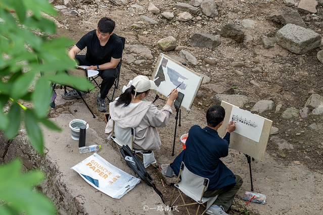 经过全长800米的木栈道便到达内三水售检票站,沿途奇峰突兀,巨石嶙峋,流水潺潺,鸟语花香,吸引不少学生模样的年轻人来写生。现在正是樱桃成熟季节,路边采摘樱桃的农民脸上洋溢着丰收的喜悦。
