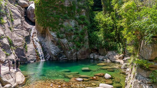 游览区大小不一的水潭众多,每个水潭都像透明的翡翠宝石镶嵌于峡谷之间。
