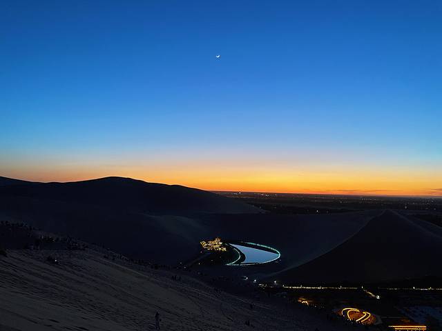 爬沙是痛苦的,但爬到沙顶是值得的!站在鸣沙山顶俯瞰月牙泉,飞儿乐队的《月牙湾》在心中响起:敦煌天空的沙砾,带着我们的记忆...梦想穿过了西域,包含了多少的禅意...看月牙湾下的泪光,在丝路之上被遗忘......