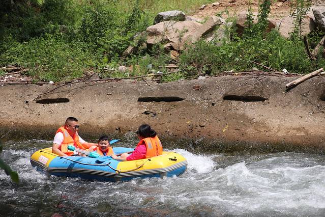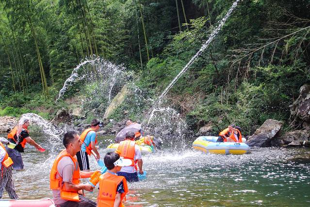 漂流的乐趣是感受自然水流的落差,在疾速前进中体会流水的力量。然而漂流的玩法绝不仅是如此,沿途的浅滩是打水仗的绝佳地,在这里无论认识与否,你都要随时做好湿身准备,因为“有朋自远方来,不亦乐乎”,在这里“泼水”才是打破隔阂的最好社交方式,也能让i人立刻变e。