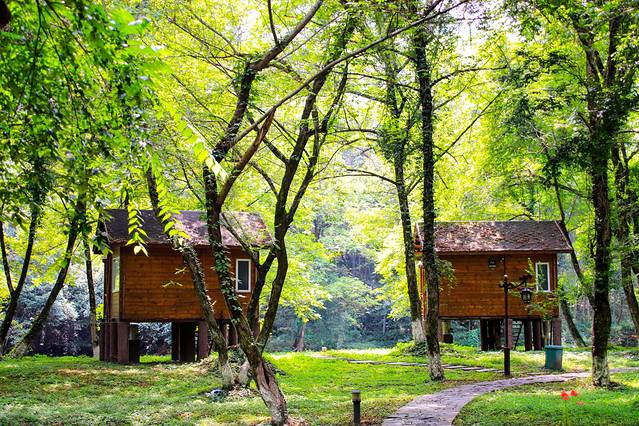 漫步绿林谷,沉浸在天然的氧吧中,一栋栋小木屋临空而起,如同一座建在森林中的童话小镇。各式各样的木屋,让你宿在森林深处,感受被绿色包围的清凉。