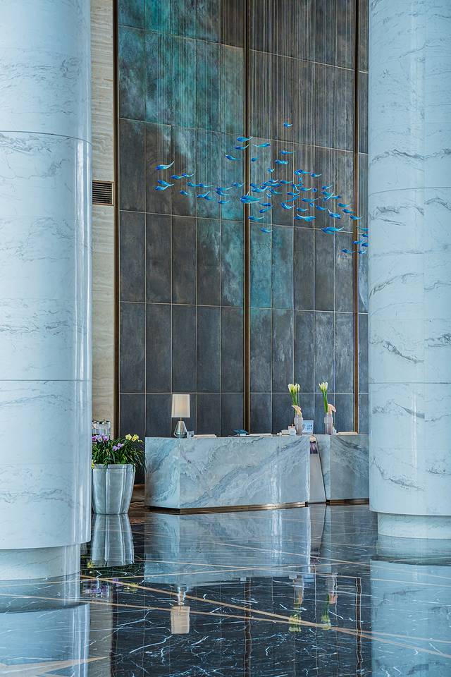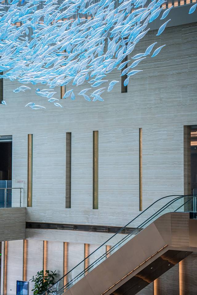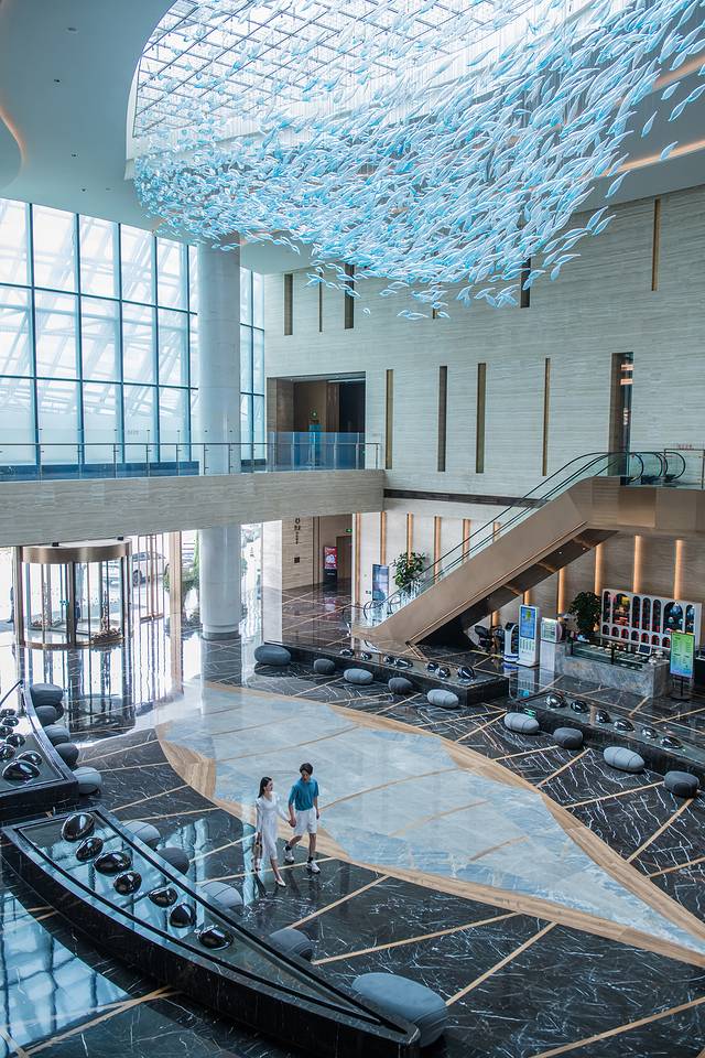 步入酒店,超高的吊顶是鱼群的设计,在阳光下闪闪发亮,仿佛有一群自由的鱼儿穿梭游过酒店的大堂。