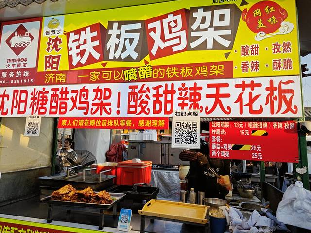 因为有足够的垃圾桶,垃圾桶有足够的空间,所以夜市的环境非常好,一点也不脏乱差。,做功课尝试了“芋泥脑袋铺”,好吃,但也好撑。尝试了沈阳铁板鸡架,特意选择的酸甜辣口味,非常推荐,酸度刚刚好,真的挺辣的。