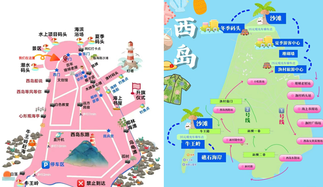 ⑥西岛:这是一个小渔村发展起来的景点,比较原生态,游玩有几种方式:一、游览车1号线2号线:25块钱,在夏季码头附近购票,招手即停,但是什么时候看到车完全凭运气。现在2号线那边在修路,只有1号线路开。二、牛王岭专线:35元,直接从码头到牛王岭,环岛游玩,如果带老人小孩,只想到此一游的可以选择此,省时省力。三、电瓶车:走过夏季码头后再沿着大路进去一点就会有岛上居民出租的,目前大概50块/天,应该可以讲价。这个适合提早做好攻略的,有些居民区的小巷可以开进去,但需要方向感好点,不然可能迷路在小道里。四、同样是岛民自己的车,自驾那种小的观光车,岛上的阿姐载你游,包车游一样,路上随便都会遇到,价格也都不贵。五、深度游;前一天上岛后住宿岛上民宿,第二天下岛,如果体力好,甚至可能步行。个人体验,第一种最不推荐,首先车只在外围大路走,里面的巷子还是要自己下车步行;再者,你不知道游览车什么时候会经过你的目的地,等不起。