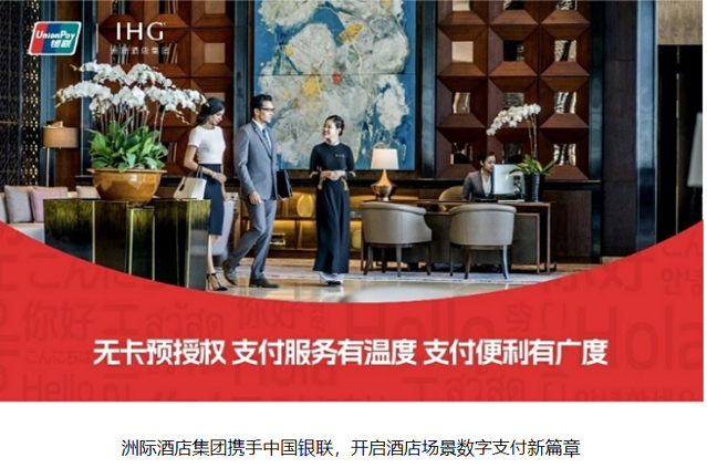 ●针对休闲散客,洲际酒店集团携手中国银联发布酒店无卡预授权解决方案,贴近境内外消费者酒店在线预订偏好,支付流程更高效、支付方式更契合,有效弥合境内外支付差异,为酒店方高效管理和外籍来华人员支付便利提供了助力,成为银联信用卡支付解决方案在酒店类重点消费场景的一次“数智化”创新探索。
