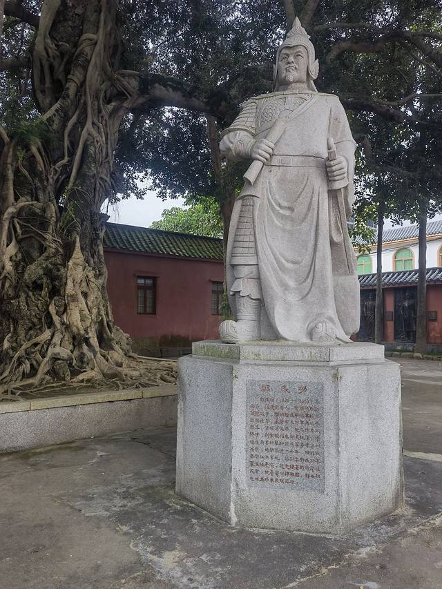 进入总兵府,在一棵大树下就是郑成功的石像。1646年,清廷兵锋南指,闽粤生灵涂炭。出于对清朝强权统治的不满和对明廷报效之心,郑成功毅然与降清的父亲郑芝龙决裂,到南澳招兵。南澳成为郑成功抗击清军、收复台湾的摇篮。据说,当年郑成功就是在这树下招兵的。