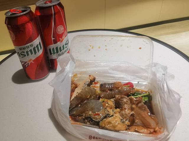 必须要来点生腌+啤酒🍺,一盒生腌,里面有大虾、梭子蟹、皮皮虾、生蚝、花螺等,40块,配上两罐乌苏,爽了…