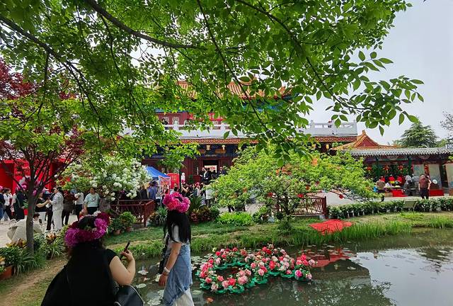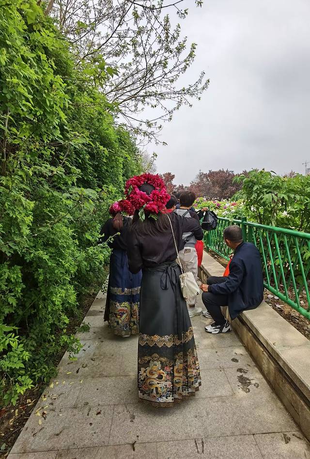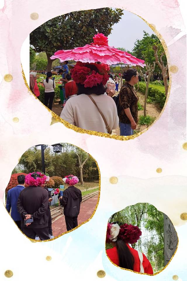 2、一道仿佛穿越唐宋的风景‖簪花。爱美之心、人皆有之,中国古代就有将鲜花或其他材料制作的头饰戴在头上的习俗,这种头饰被称为“簪花”,尤其是牡丹盛开时节,不论男女、不分贵贱,都要在头上戴“簪花”;在曹州牡丹园我看到了戴“簪花”的人流,不由得想起了苏东坡的一句“人老簪花不自羞,花应羞上老人头” 的名句。穿汉服、戴“簪花”,这种“新中式”的游玩方式愈来愈受到人们的推崇,我想:之所以受到欢迎,这得归功于中国的千年文化底蕴和历史基因。一朵朵簪花、一片片繁花,这是一道流动着的风景,身在其中,仿佛穿越到了唐宋。