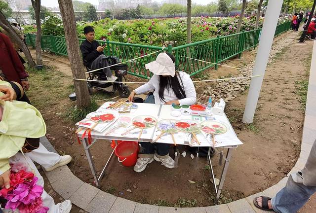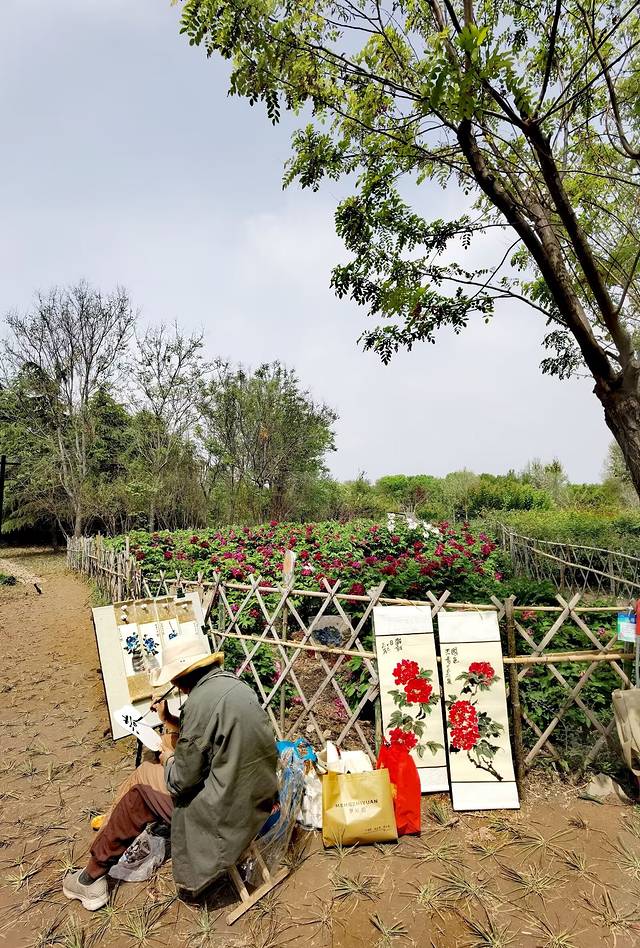 3、一道让你驻足一看的风景‖画画。在园内,我看到了有专业画家在画馆内作画,也看到了有民间画家在花圃边写生,这些画作均已牡丹为主要素材,这个场景俨然成了我们走过路过也会驻足一看的一道风景。与一位民间画家唠嗑了一会儿,涨知识了!原来牡丹竟然是国画里的百搭花卉,不管怎么搭,寓意都很吉祥。如:牡丹+大象=富贵有象、 牡丹+锦鸡=锦上添花、牡丹+秋海棠=富贵满堂;又如:牡丹+藤萝=富贵胜远、牡丹+桂圆=富贵姻缘、牡丹+缠枝连纹=连连富贵;再如:牡丹+天竺=天祝富贵、牡丹+荷花+瓶子=富贵和平、牡丹+菊花+莲花+蝴蝶=捷报富贵连寿……