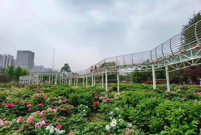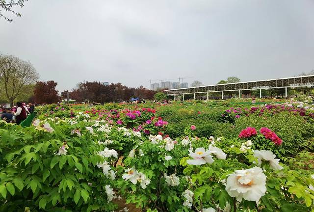 3、花景。园内种植了50多种不同的植物,牡丹是园内的主要景观植物,品种有豆绿、玉板白、贵妃插翠等珍贵牡丹180余种。由于热岛效应的影响,天香公园的温度相对较高,牡丹往往会提前绽放,我们去菏泽的时候,曹州牡丹园刚进入盛花期,而天香公园的牡丹却绝大部分谢幕了,已进入晚花期,园内的一位当地游人告诉我们:曹州牡丹园的早花期,实际上天香公园已进入盛花期。在园内看到的虽然是凋零的牡丹,但可以想像到盛花期的花景,绝对也是一场视觉盛宴,就像曹州牡丹园一样。